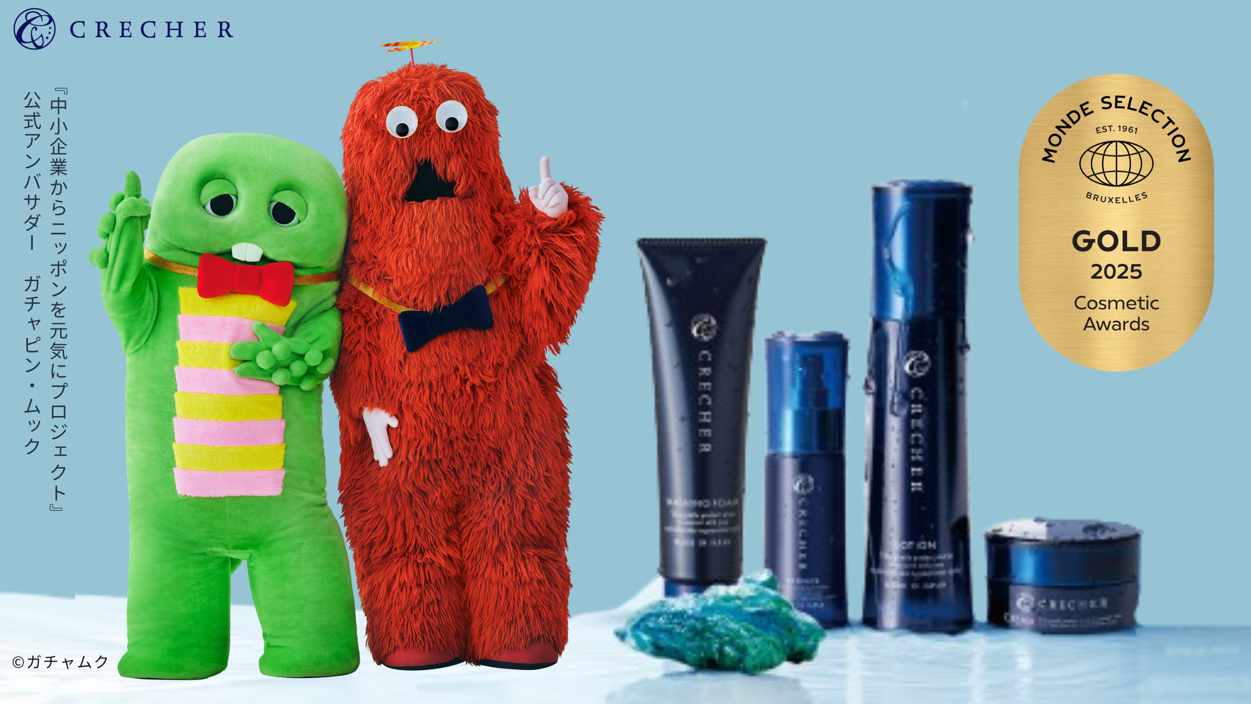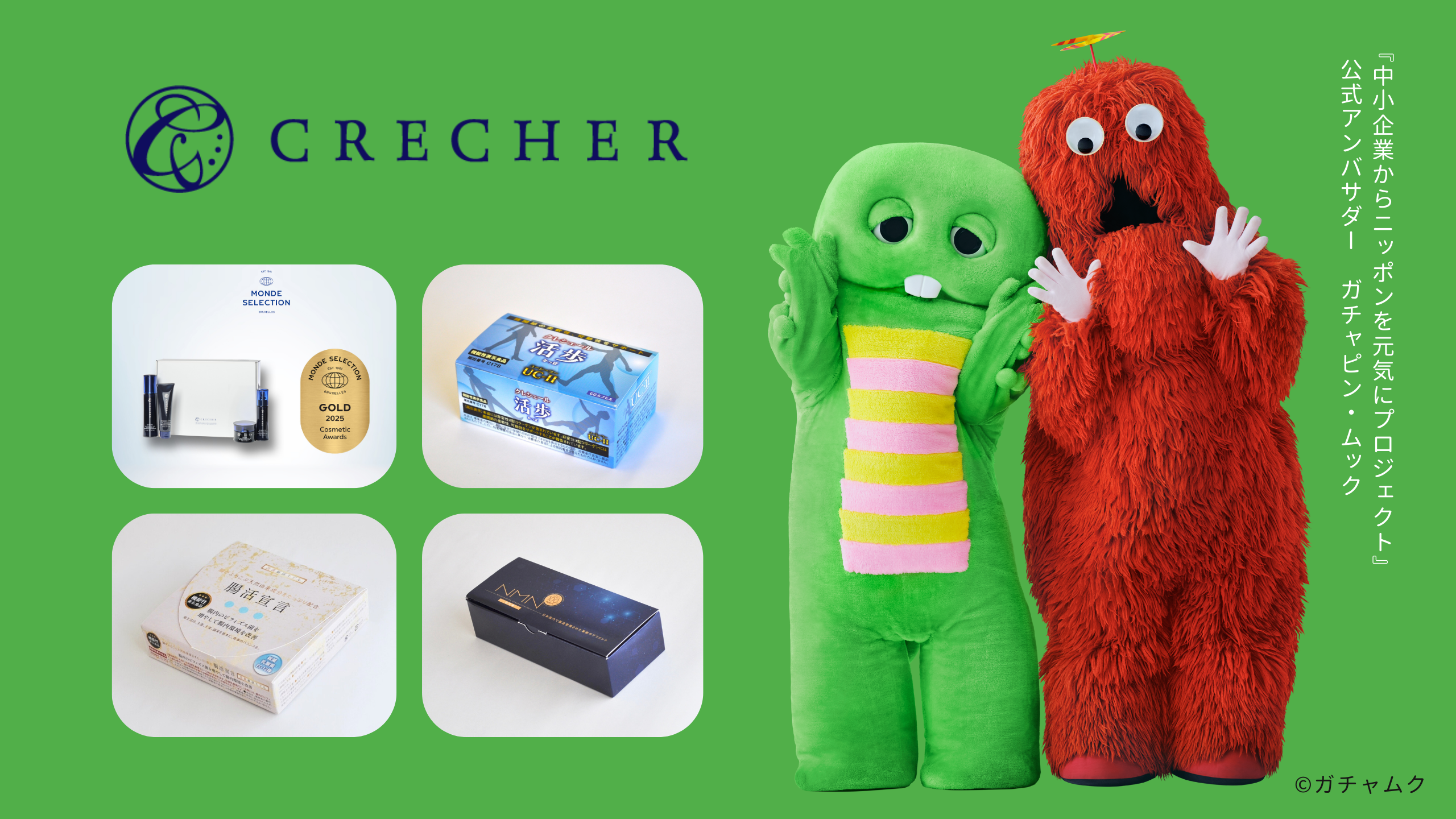 2026年2月2日より、ガチャピン・ムックが公式アンバサダーを務める『中小企業からニッポンを元気にプロジェクト』に参画し、『クレシェールローション・機能性表示食品 腸活宣言・NMN(健康補助食品)』3商品のプロモーションを開始!