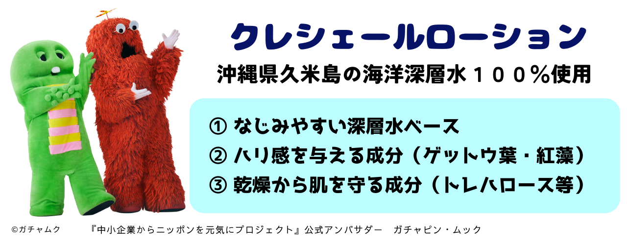 クレシェールローションは、お肌になじみやすい使い心地を考え、沖縄県久米島の海洋深層水を100%使用しています。
